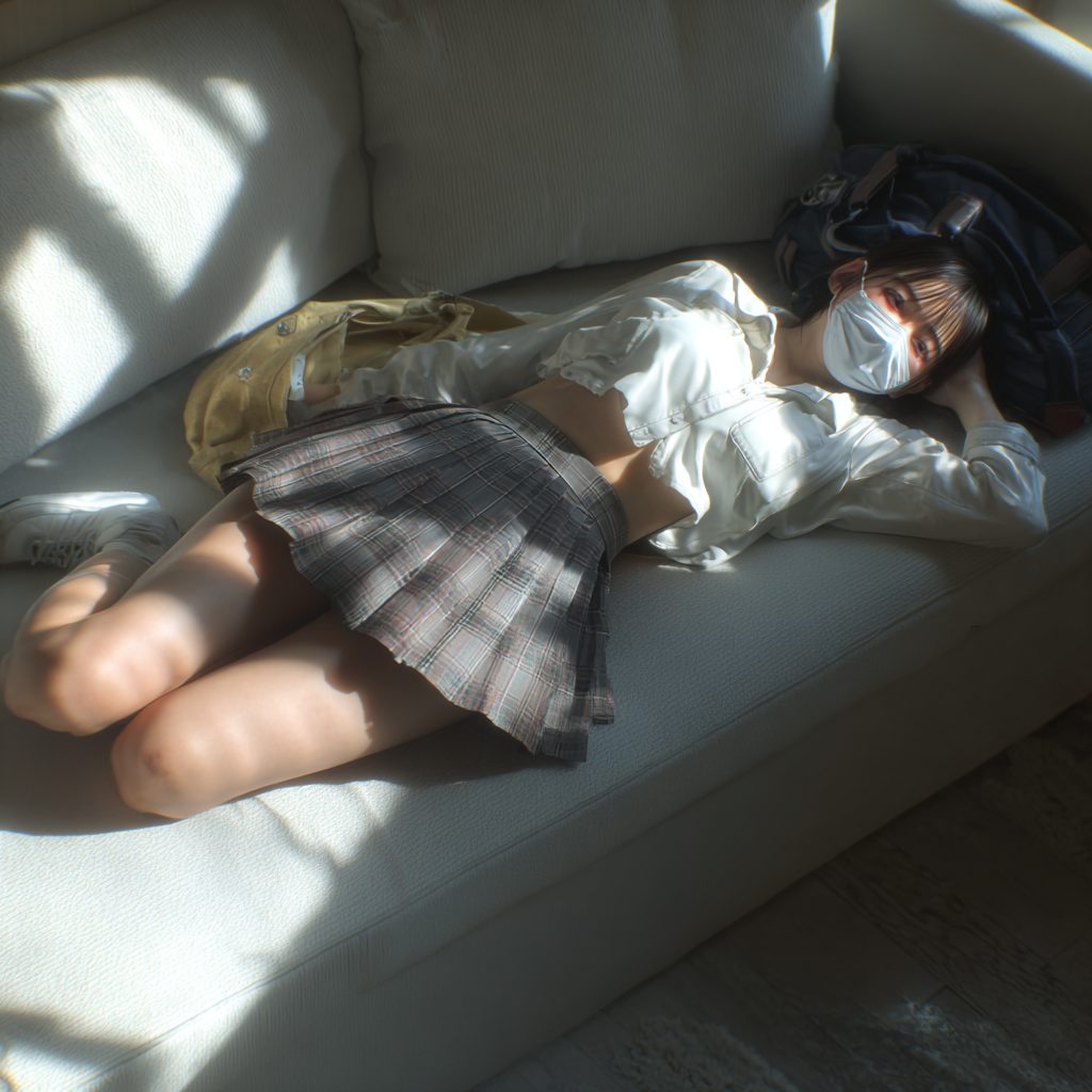 スマホに意識を奪われたまま、膝を崩し、太ももを投げ出し、重力に身を預けるようにソファに沈み込んでいく。
