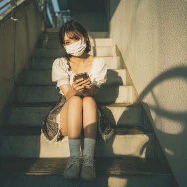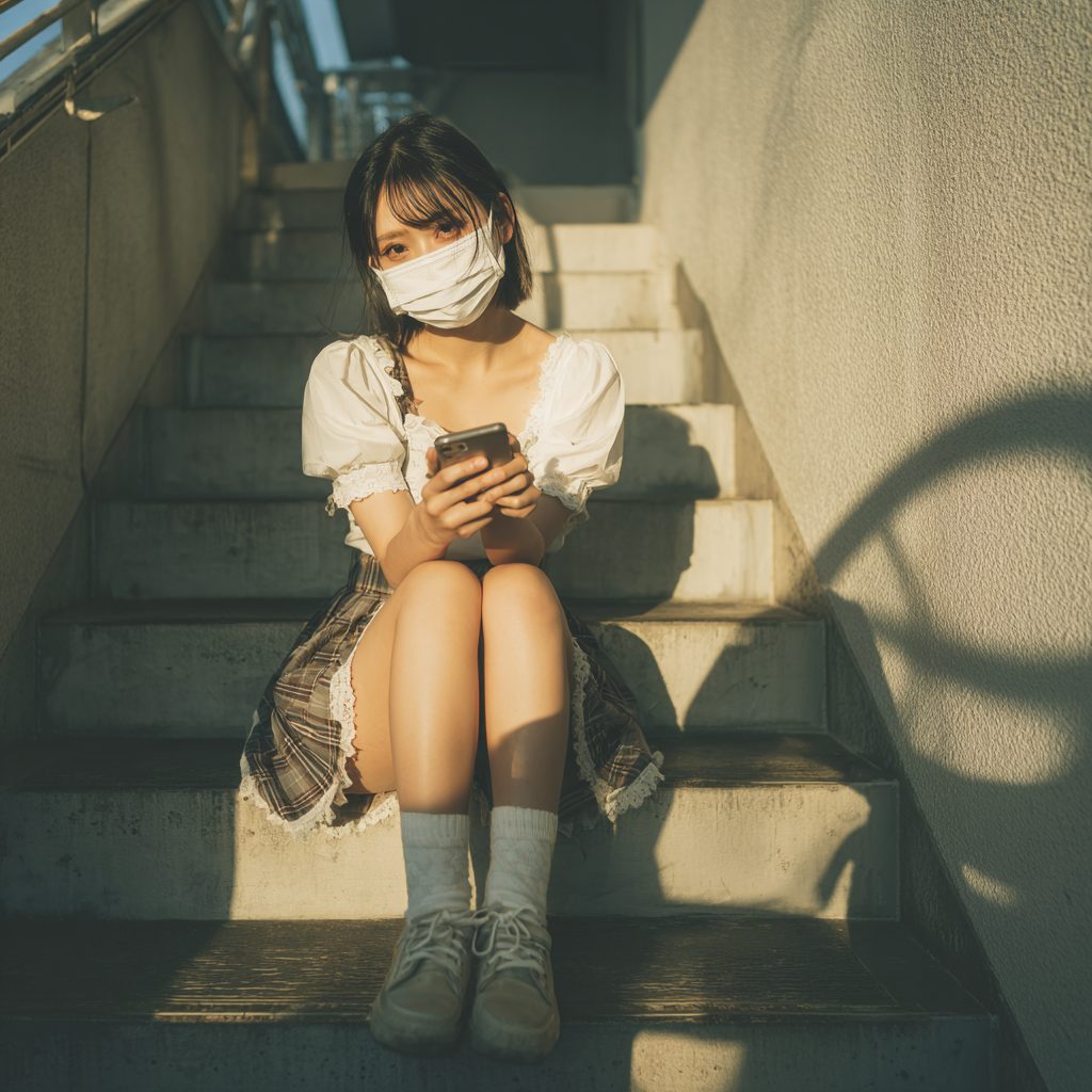 ビルの屋上。周囲を囲う金属フェンスの隙間から、街の喧騒が遠くに聞こえる。けれど、ここには誰もいない。時間が止まったような静けさのなかで、彼女はひとり、階段に腰を下ろしていた。