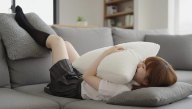 レンタルルームのソファに腰をかけたhinaが、制服のスカートの裾を直す。