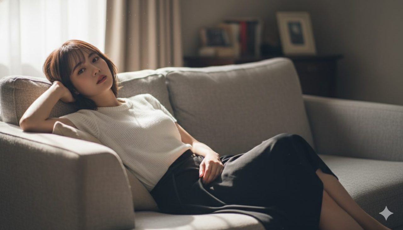 白ニットにベストを重ねた制服姿のまま、彼女はソファに腰を下ろす。