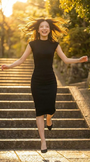 夕暮れの階段。黄金の光が降り注ぐ。