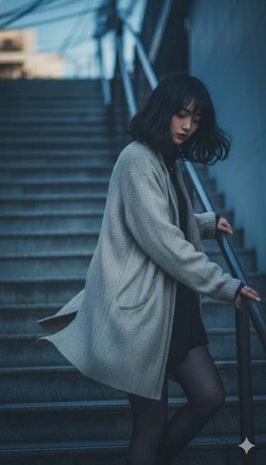 階段の途中。立ち止まる。