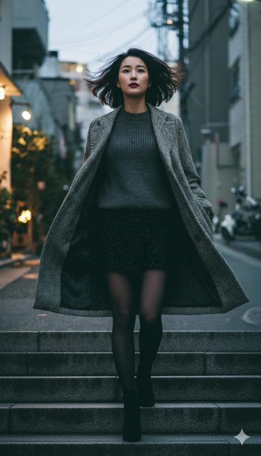 ブルーアワーの路地を歩く。 ヘリンボーンのコートに包まれて。 ポケットに手を入れて。 赤いリップを引いている。