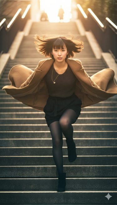 三段、四段。 ショートブーツが階段を刻む。 リズムは速くない。でも、止まらない。