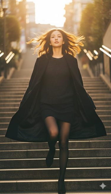 夕暮れの階段の前に立つ。 黒いコート。黒いニット。黒いスカート。 今日の私は、迷いの色を一つも持っていない。