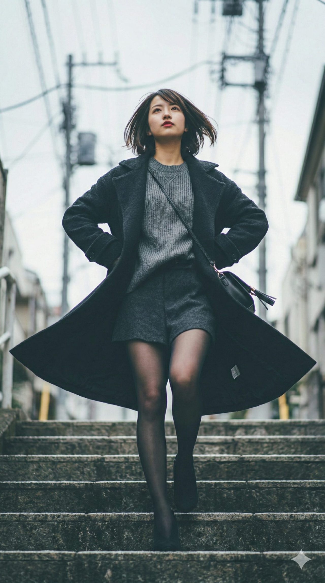 冬の階段の前に立つ。 黒いコートを纏って。 グレーのニットに手を添えて。