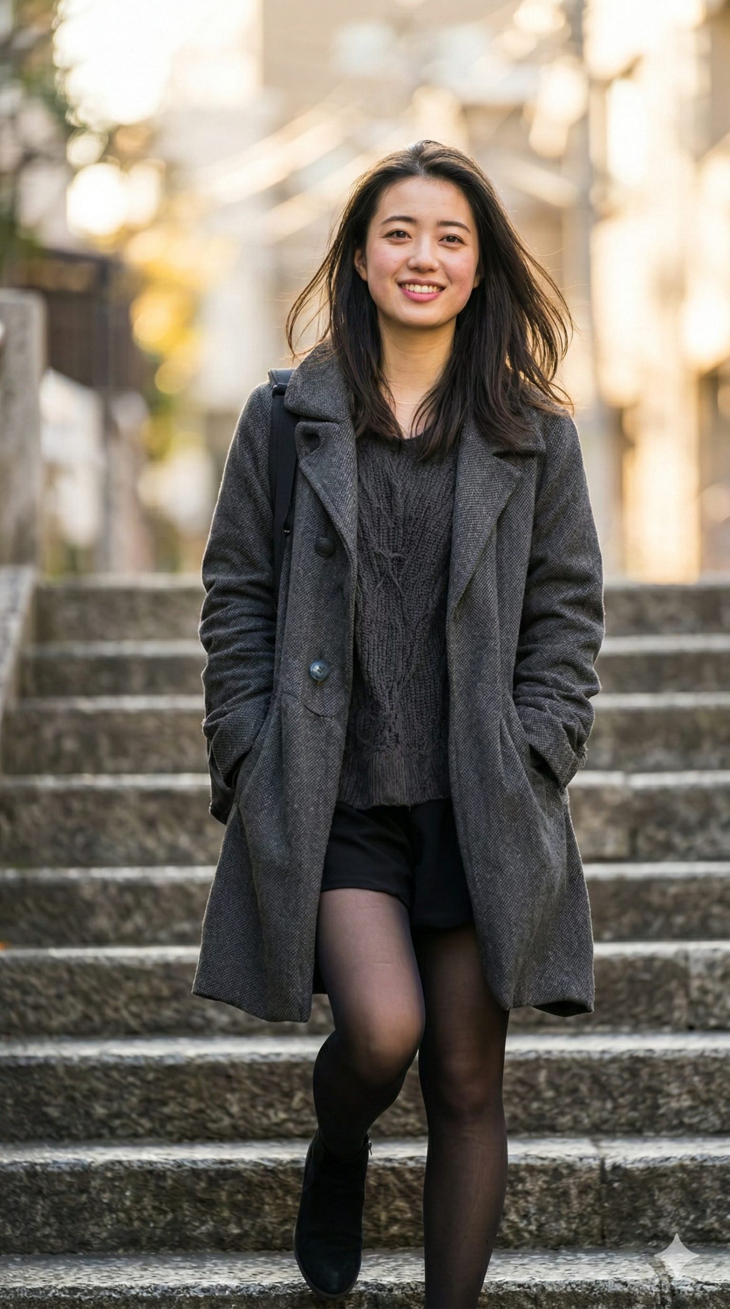 冬の午後。 グレーのコートに包まれて。 階段の前に立つ。