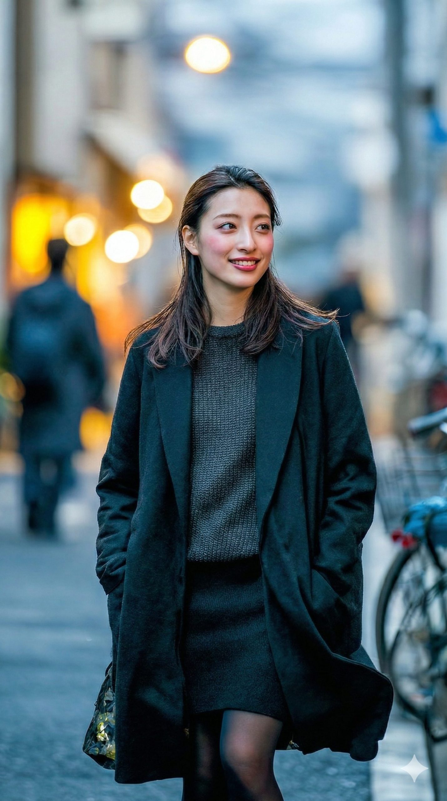 ブルーアワーの階段に立つ。 街灯がにじんで、青い空気の中に浮かんでいる。