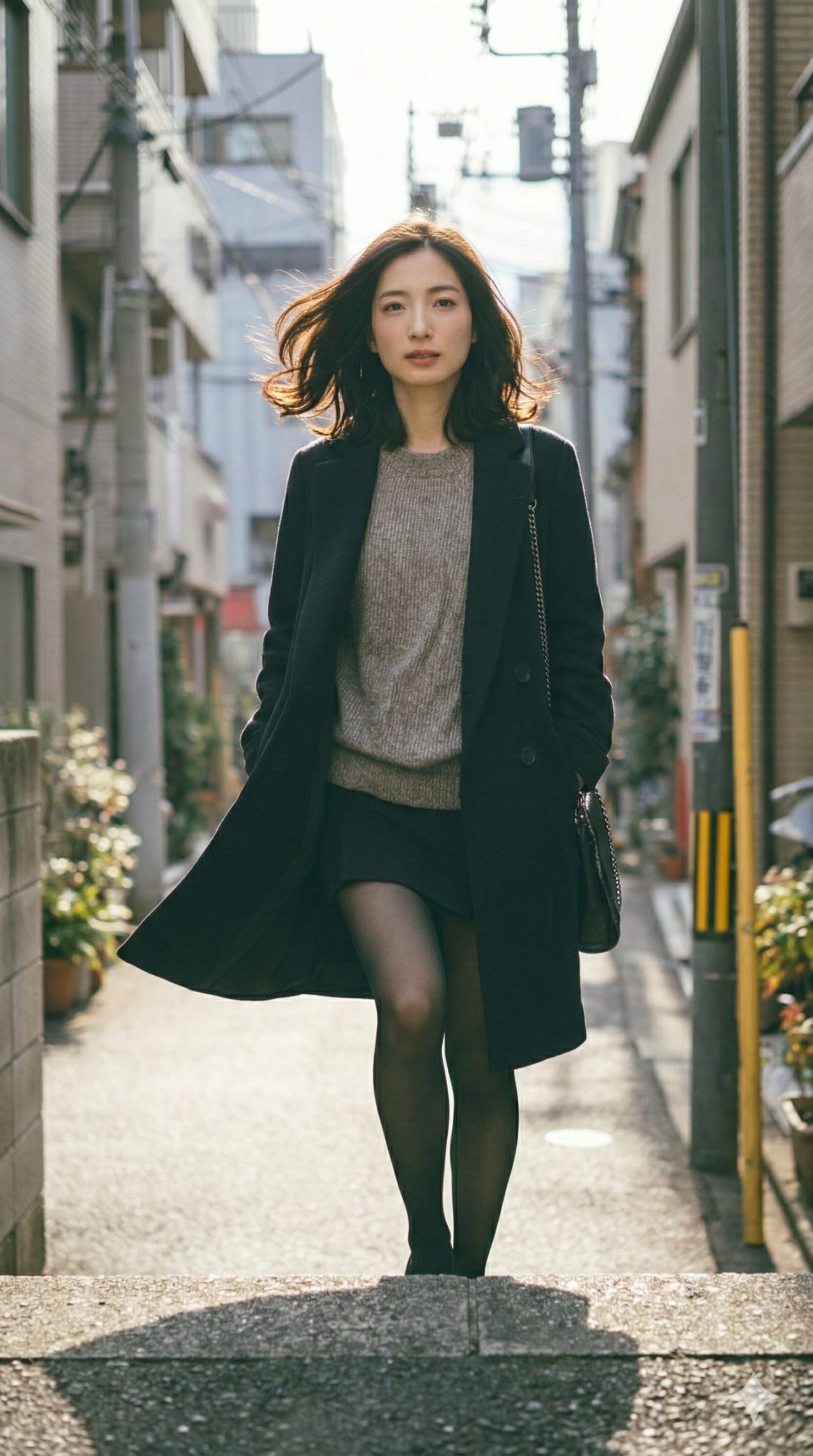 冬の午後。 階段の前に立つ。 黒いコートを纏って。 グレーのニットに手を添えて。