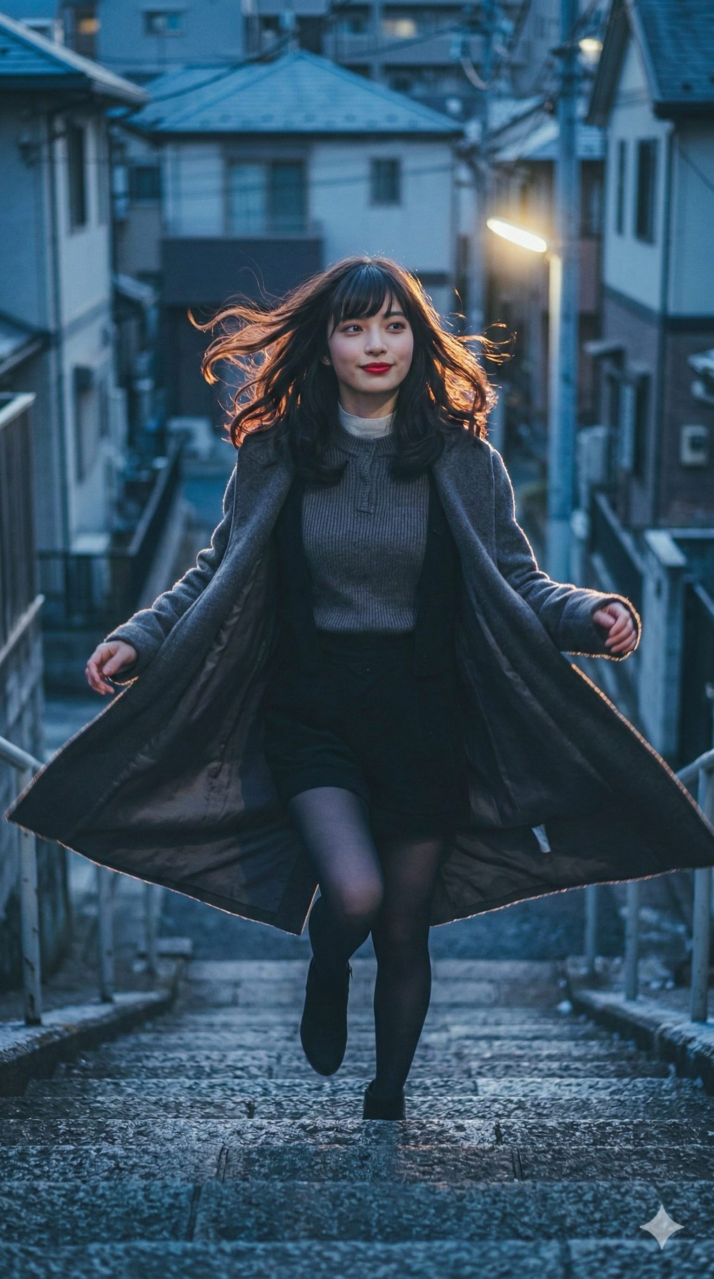 冬の階段の前に立つ。 グレーのコートを纏って。 赤いリップを引いて。