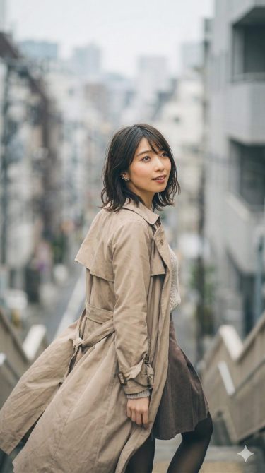 一段目。 ベージュのトレンチの裾がひらめく。 冷たい風が後ろから押してくる。