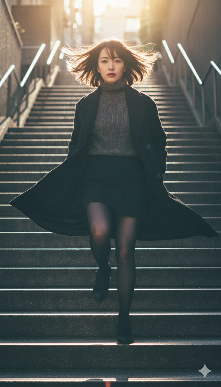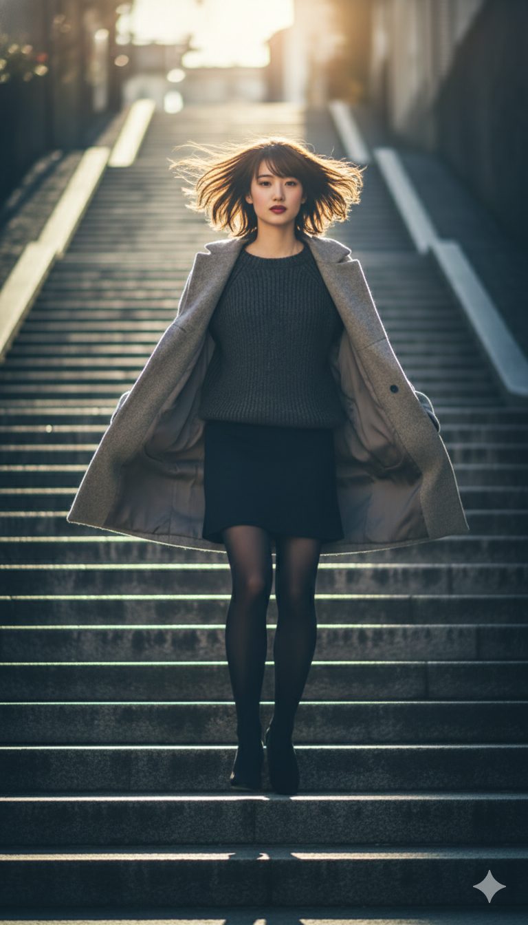 「登るの?」 風が聞いた。 夕暮れの階段の前に立つ。 黒いコート。黒いニット。黒いスカート。 今日の私は、迷いの色を一つも持っていない。 一段目。 足を踏み出す。 ヒールの音が、路地に響く。 風が吹いた。 髪が揺れる。 コートの裾が舞う。 でも、足は […]